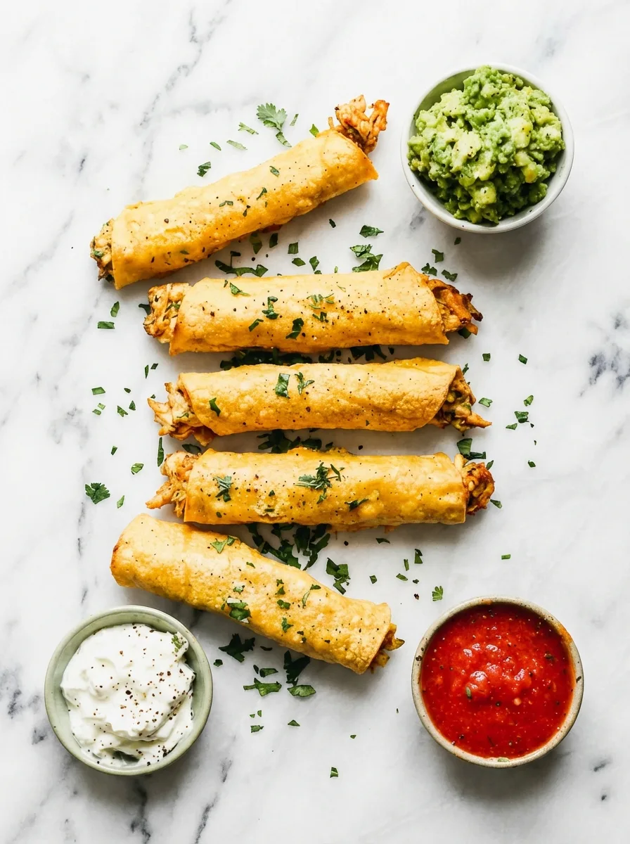 Des taquitos au poulet croustillants avec une garniture crémeuse, parfaits pour un apéritif gourmand ou un dîner rapide.