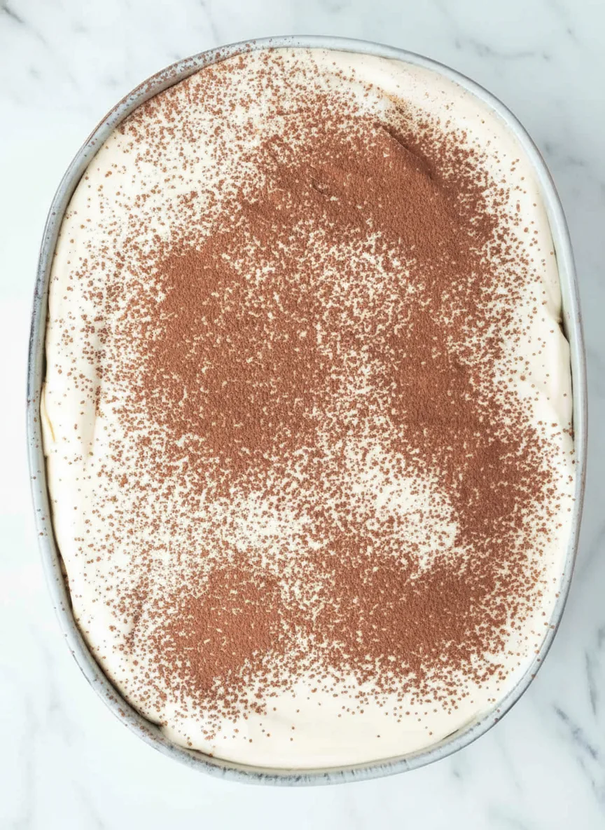 Trempez rapidement chaque biscuit dans le mélange café-cacao. Disposez-les au fond d’un plat rectangulaire ou carré. Versez la moitié de la crème sur cette première couche en lissant bien. Saupoudrez légèrement de cacao. Répétez l’opération pour former une seconde couche identique. Terminez par une généreuse poudre de cacao en surface.