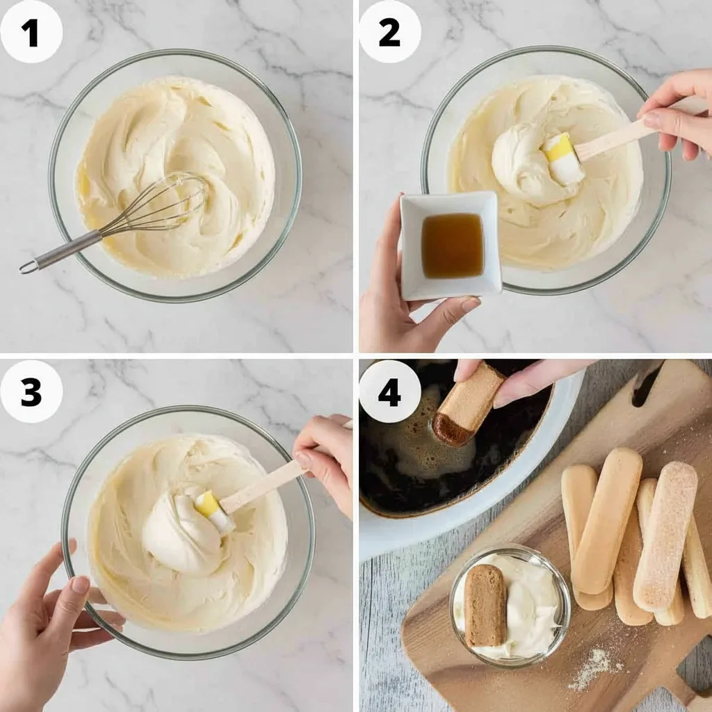 - Trempez rapidement chaque biscuit savoiardi dans le mélange café avant de disposer au fond des verrines.