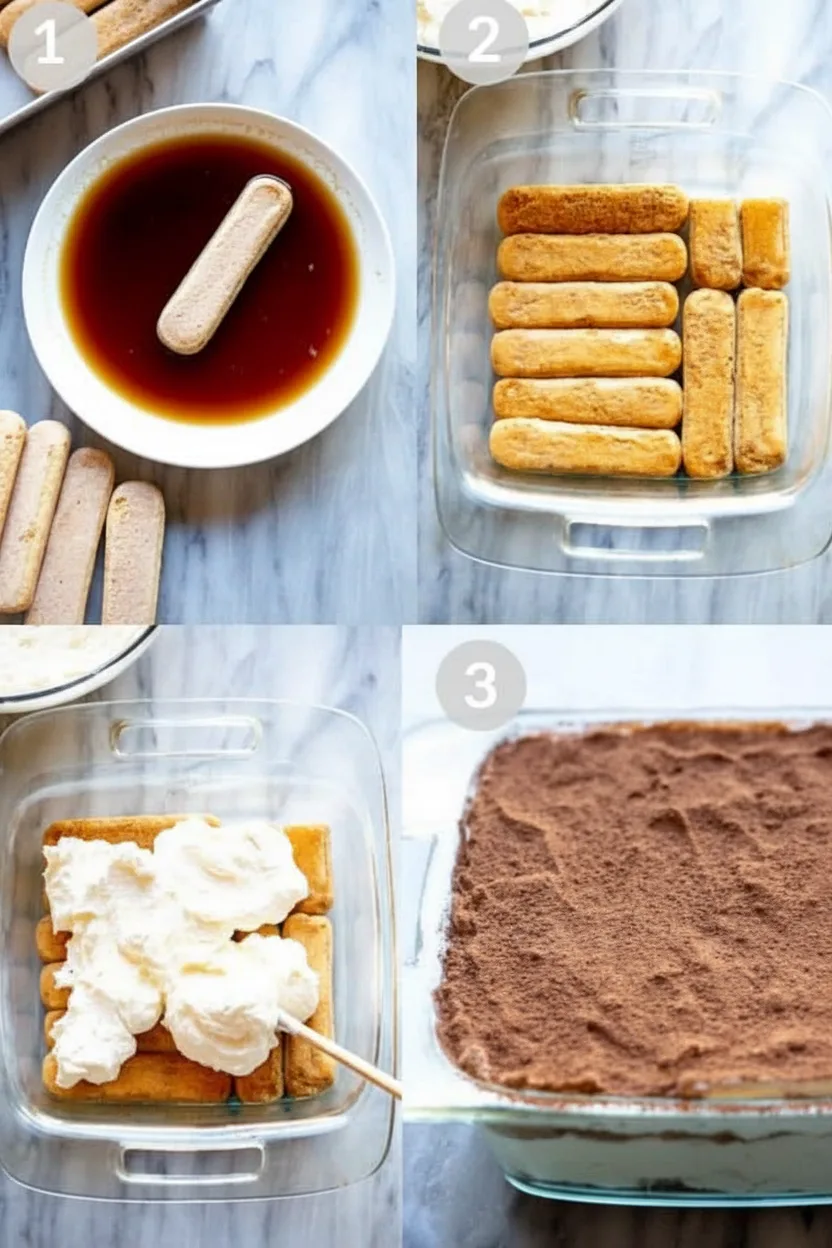 Mélangez l’espresso et le sirop de café dans une assiette creuse. Trempez rapidement chaque biscuit savoiardi des deux côtés sans les détremper. Disposez-les en une couche uniforme au fond d’un plat carré de 20×20 cm. Étalez la moitié de la crème mascarpone sur les biscuits. Répétez l’opération avec une seconde couche de biscuits imbibés et le reste de crème.