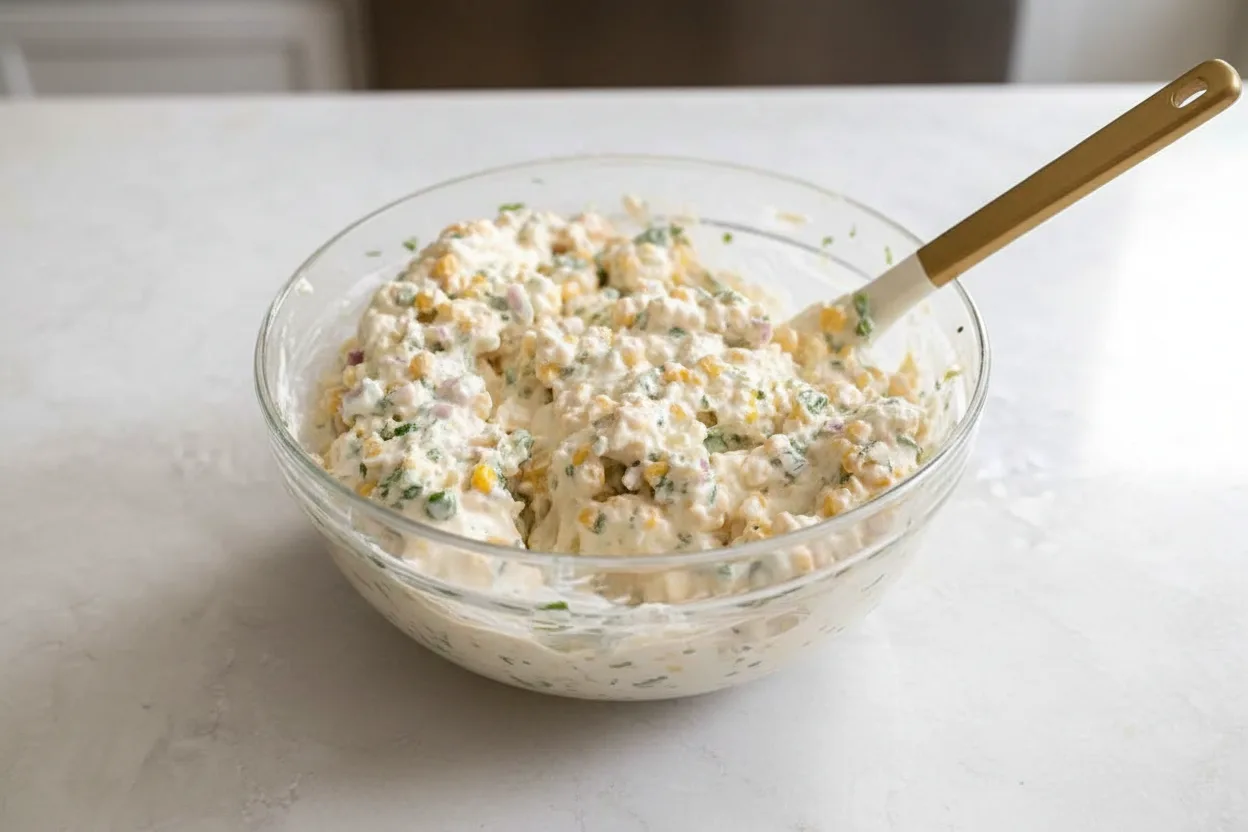 Transvasez la preparation cremeuse dans un grand saladier. Ajoutez le reste du fromage rape (environ une autre tasse), le mais egoutte, le fromage feta emiette, le jalapeno hache, l’oignon rouge hache et la coriandre hachee. Melangez le tout delicatement a la spatule jusqu’a ce que les ingredients soient bien enrobes. C’est la que la trempette prend vie avec toutes ses couleurs et textures.