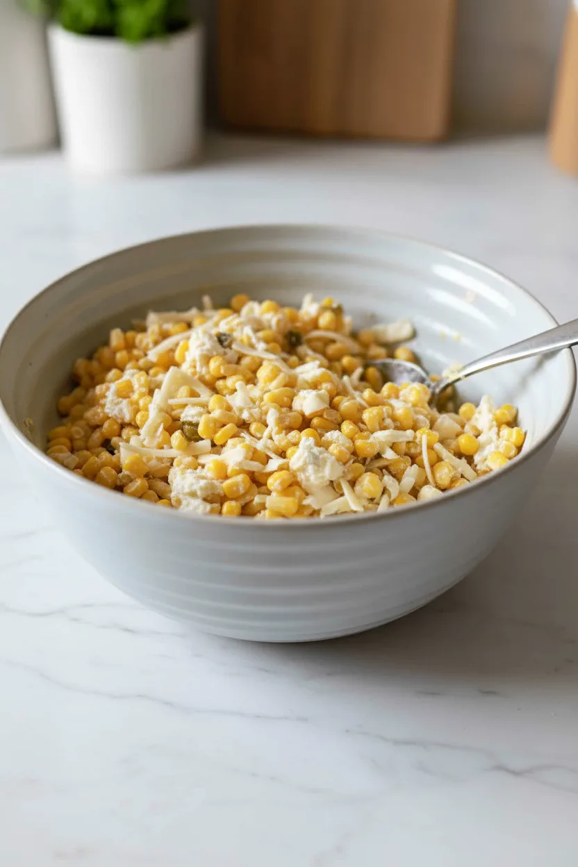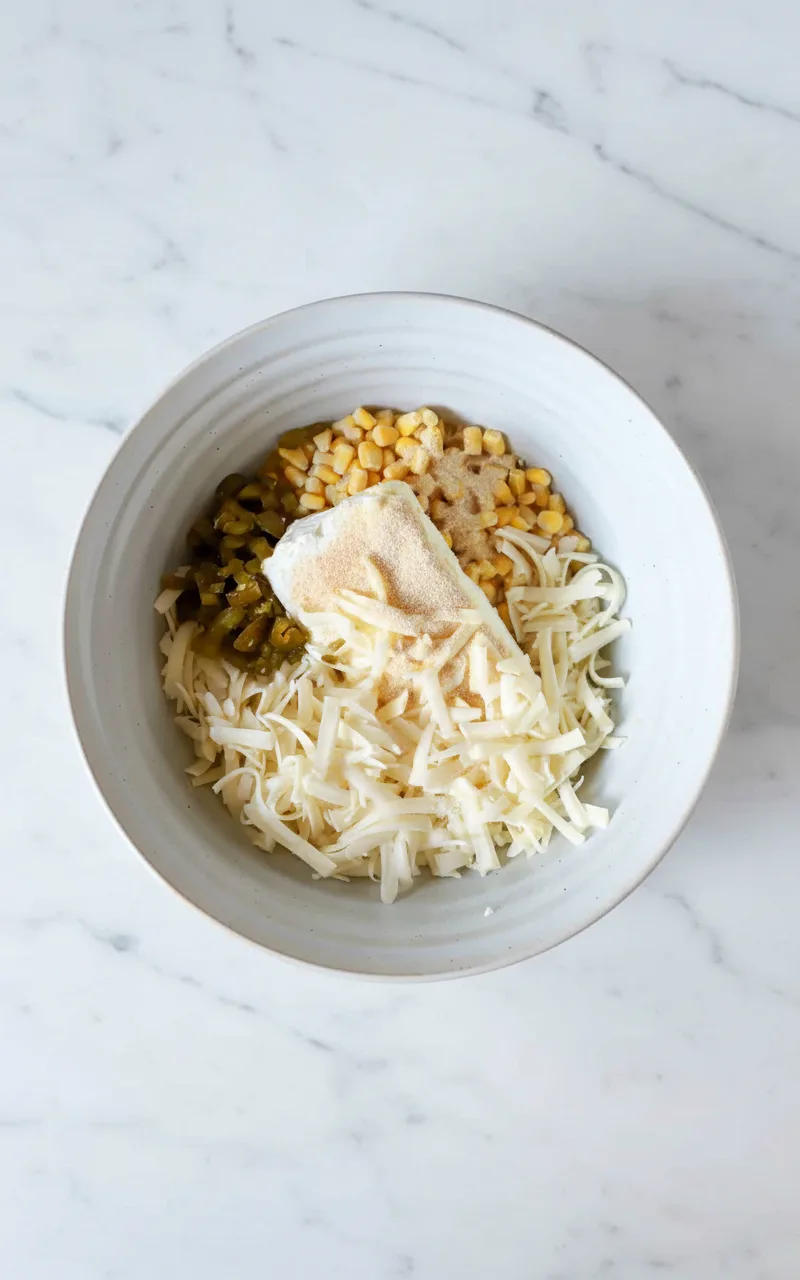 Dans un grand saladier, combinez le maïs surgelé (pas besoin de le décongeler), les jalapeños marinés hachés, le sel, la poudre d’ail et la poudre d’oignon. Ajoutez la plus grande partie du fromage râpé, en réservant environ une poignée pour la garniture finale. Incorporez enfin le fromage à la crème ramolli. Utilisez une fourchette ou une spatule pour bien écraser et mélanger le fromage à la crème avec les autres ingrédients jusqu’à obtenir un mélange homogène.