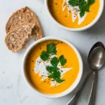Goûtez et ajustez l’assaisonnement avec du sel et du poivre. Pour une présentation élégante, versez le velouté dans des bols préchauffés et décorez d’une touche de lait de coco et de graines grillées.