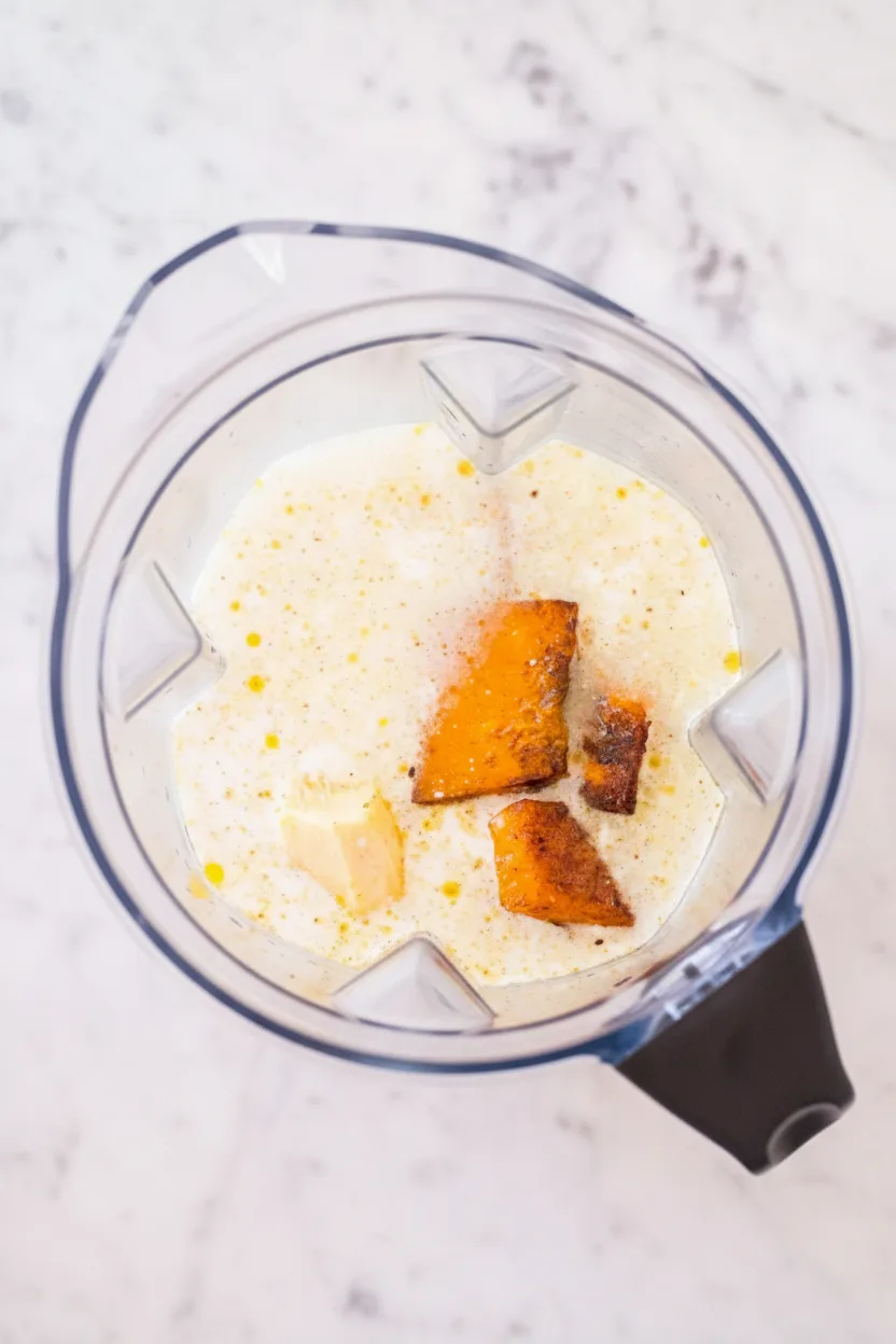 - Mixez le potiron, bouillon, lait de coco et gingembre jusqu’à consistance lisse.