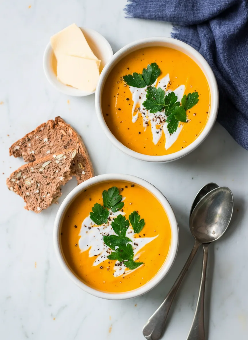 Servez cette soupe en entrée ou comme plat principal accompagné de bon pain grillé. Pour des repas du soir réussis, complétez-la avec une salade croquante ou un sandwich chaud. Pensez aux garnitures créatives : graines de courge toastées, crème de coco swirlée ou fines herbes ciselées.